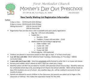 Mother’s Day Out Preschool is an Educational Preschool Ministry of Fort Payne First Methodist Church.